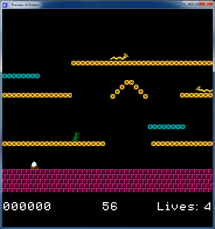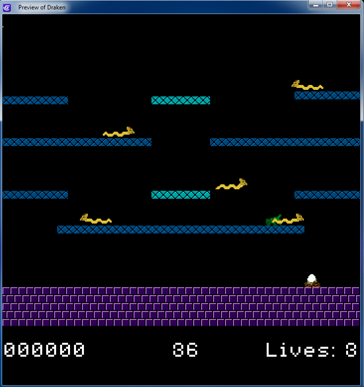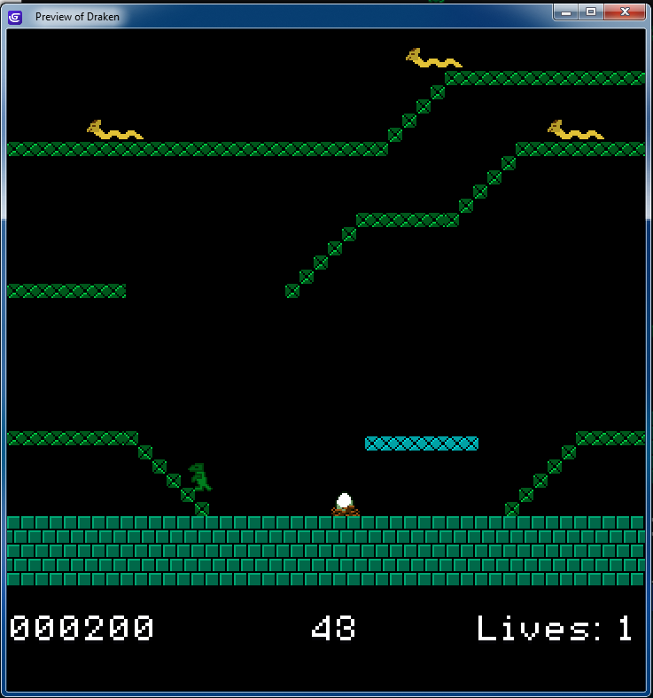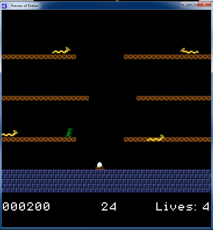 A short arcade game in a fixed perspective, featuring a drake (wingless dragon) as the main character.